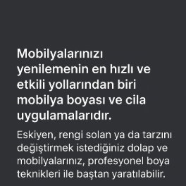 Mutfak dolaplarımın rengi sararmıştı, komple değiştirmek çok maliyetli olacaktı. Boya ve kapak yenileme yaptılar, sonuç sıfır mutfak gibi! Temiz çalıştılar, teslim tarihi neyse o gün bitirdiler. Kesinlikle tavsiye ederim.